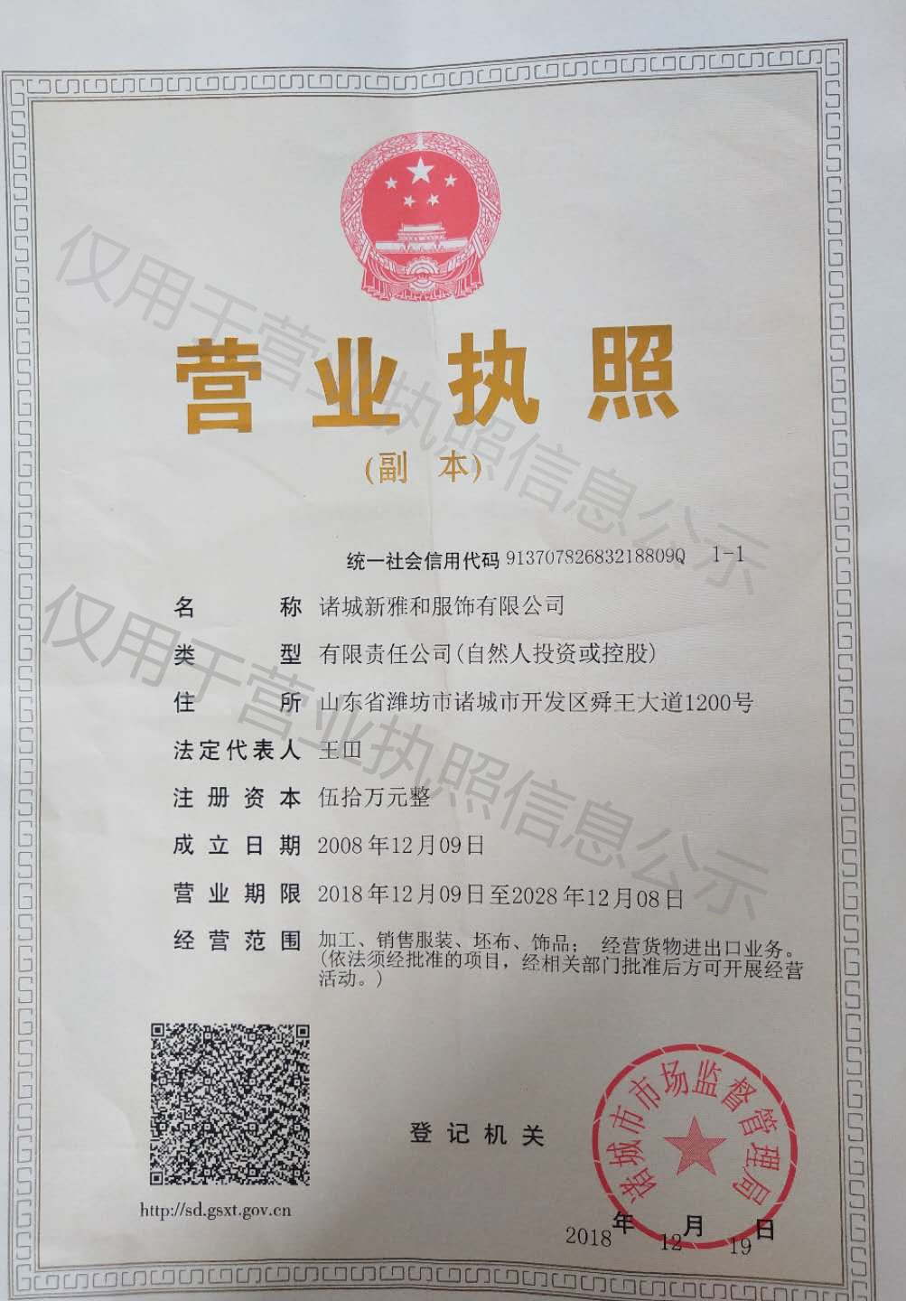諸城新雅和服飾有限公司是一家擁有自營進出口權、集貿工一體的現(xiàn)代化針織服裝加工出口企業(yè)。公司座落在諸城開發(fā)區(qū)橫四路北206國道以東。公司現(xiàn)有現(xiàn)代化日本進口電腦縫制設備200多臺套,職工300人,年出口創(chuàng)匯1000萬美元。公司擁有一個團結務實、業(yè)務嫻熟、反應迅速、年輕化、現(xiàn)代化的管理團隊。